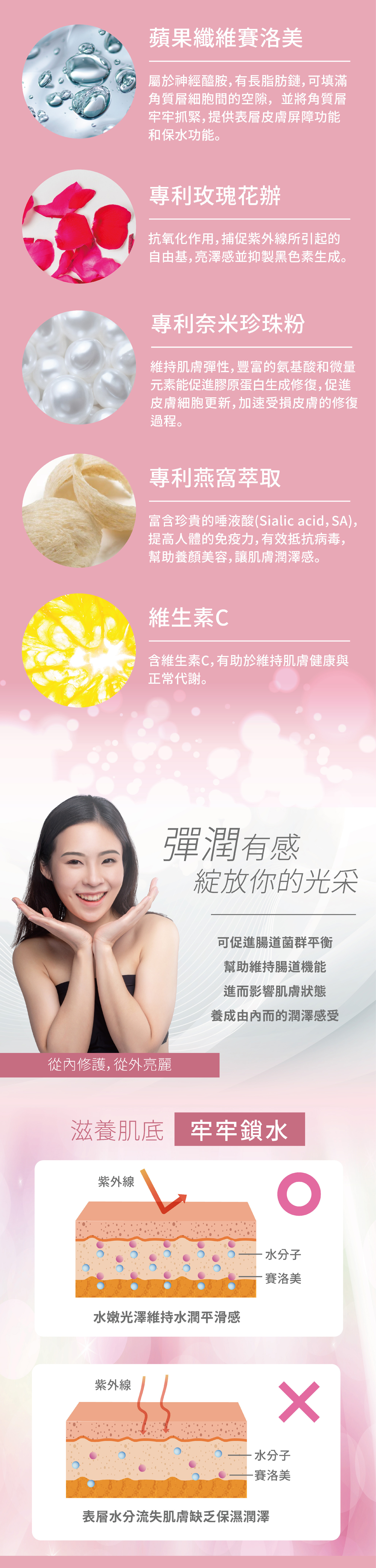 日本玫瑰花瓣、奈米珍珠粉、燕窩萃取、德國膠原蛋白、日本與韓國乳酸菌等高機能成分。
